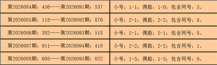 统计3D历史上已开出的奖号发现,在连续5期开奖号码中:3D在第2026084期-第2026088期分别开出奖号:456-118-382-911-608。